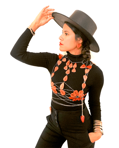 Designer Liliana Salazar channeled both her grandmothers while in Colombia.  She offered her hands to be in service and was guided to bring to life this vision.  With the help and partnership of Colombian artisans, each of the 122 strawberry pieces are connected by hand with love.